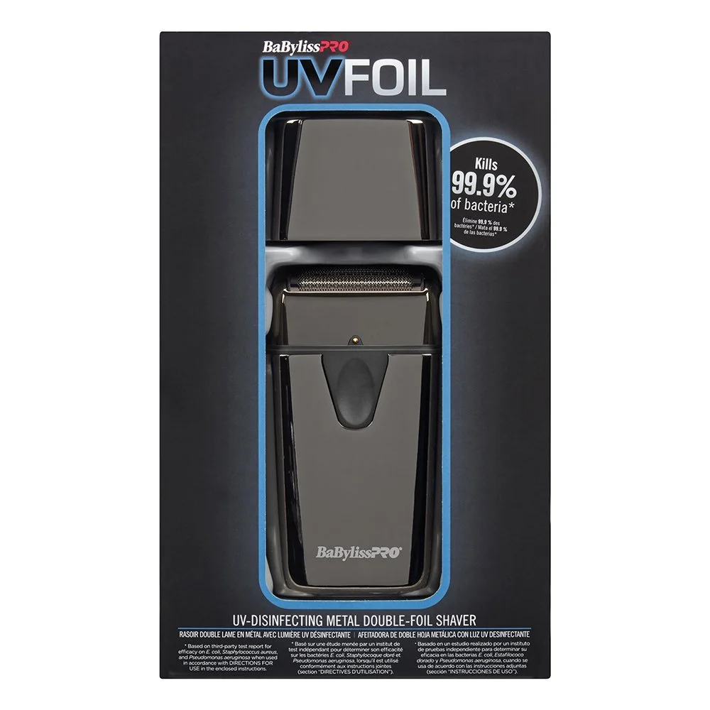 First to market, the BaBylissPRO UVFoil Shaver is the definitive UV-Disinfecting Metal Double Foil Shaver designed specifically for barbers. Our UVFoil is more than just a shaver; it’s a hygiene powerhouse. Equipped with UV light technology, it effectively kills 99.9% of bacteria*, including E. coli, Staphylococcus aureus, and Pseudomonas aeruginosa when used in accordance with the enclosed instructions.